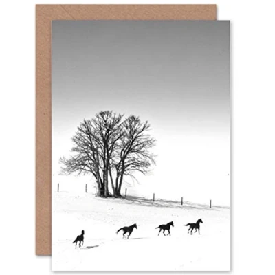 Wee Blue Coo CARD GREETING GIFT PHOTO WINTER LANDSCAPE BARE TREES RUNNING HORSES
