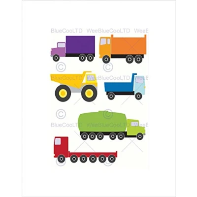 Wee Blue Coo Cartoon Trucks Children Kids Colourful Illustration Wall Art Print