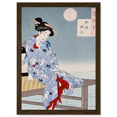 Wee Blue Coo Chikanobu Japanese Geisha Pier Moon Artwork Framed Wall Art Print A4