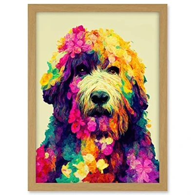 Wee Blue Coo Colourful Vibrant Floral Labradoodle Dog Abstract Portrait Artwork Framed A3 Wall Art Print