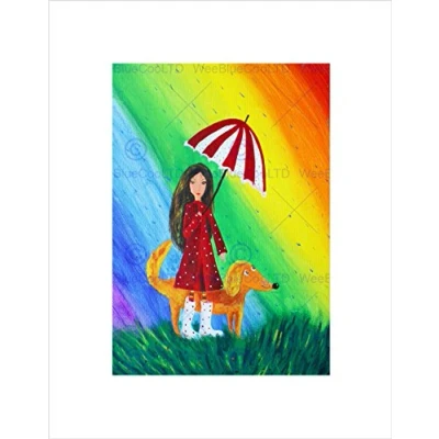 Wee Blue Coo Drawing Girl Dog Rainbow Umbrella Rain Colour Red Coat Wall Art Print