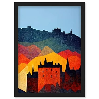 Wee Blue Coo Edinburgh in Autumn Scotland Scottish Modern Folk Art Multi Coloured Cityscape Artwork Framed Wall Print A4