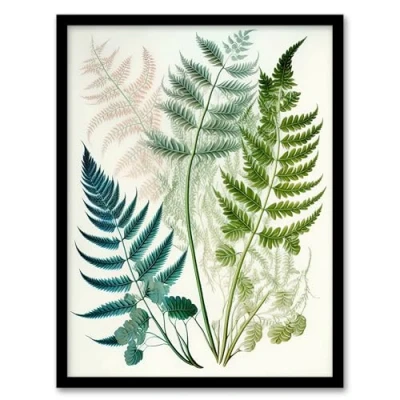 Wee Blue Coo Elegant Fern Fronds Foliage Linocut Artwork Green Teal Pink Bright Botanical Nature Framed Wall Art Print A4