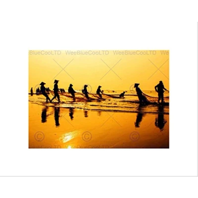Wee Blue Coo Fishing Nets Dawn Vietnam Pulling Silhouette Yellow Wall Art Print