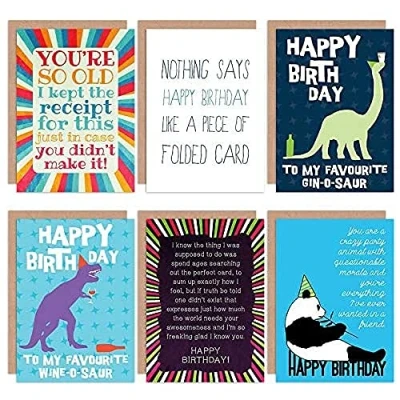 Wee Blue Coo Funny Happy Birthday Friends BFF Wine Gin O Saur All Occasions Various Assorted Blank Greeting Cards With Envelopes Pack of 6