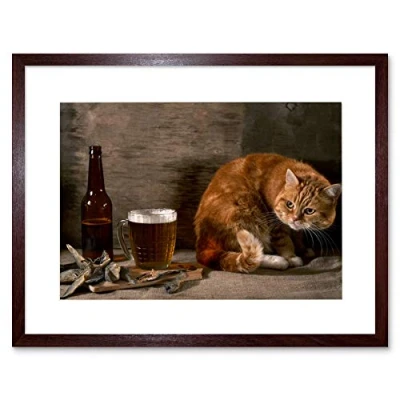 Wee Blue Coo GINGER CAT FISH AND BEER LAGER BLACK FRAME FRAMED ART PRINT PICTURE B12X9486