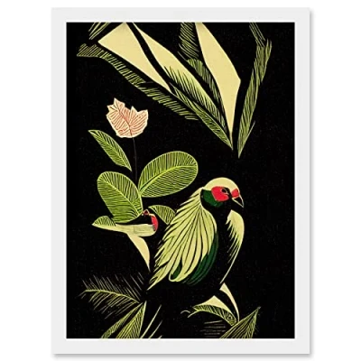Wee Blue Coo Green Black Modern Vintage Tropical Plant Leaves with Bird Artwork Framed Wall Art Print A4