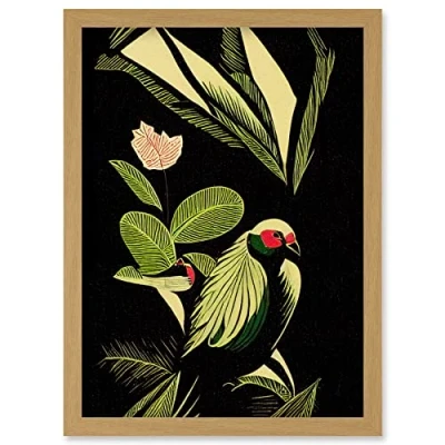 Wee Blue Coo Green Black Modern Vintage Tropical Plant Leaves with Bird Artwork Framed Wall Art Print A4