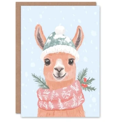 Wee Blue Coo Greeting Card Cute Llama Snow Ball Hat Winter Scarf Fun Modern For Her Woman Xmas Christmas
