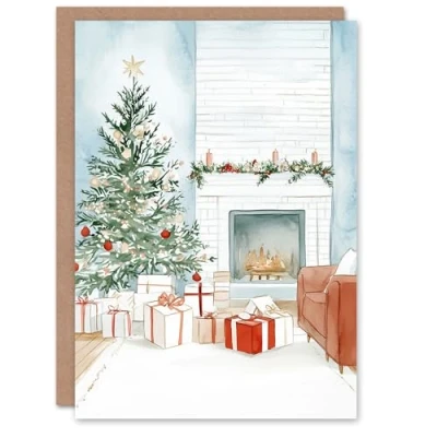 Wee Blue Coo Greeting Card Decorated Fireplace Tree Presents Watercolour Blank For Him Or Her Art Xmas Christmas