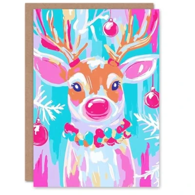 Wee Blue Coo Greeting Card Festive Reindeer Vibrant Pink Modern For Her Woman Xmas Christmas
