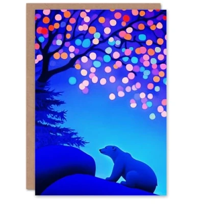 Wee Blue Coo Greeting Card Polar Bear Colourful Fairy Lights Tree at Night Blank For Him Or Her Art Xmas Christmas