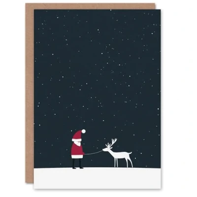 Wee Blue Coo Greeting Card Santa Claus With White Reindeer in Snow Modern Blank For Him Or Her Art Xmas Christmas