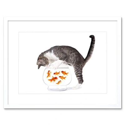 Wee Blue Coo Grey Tabby Cat Goldfish Bowl Fishing Picture Framed Wall Art Print