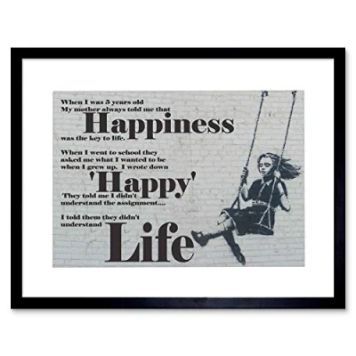 Wee Blue Coo Happiness Happy Banksy Girl Swinging Quote Picture Framed Wall Art Print