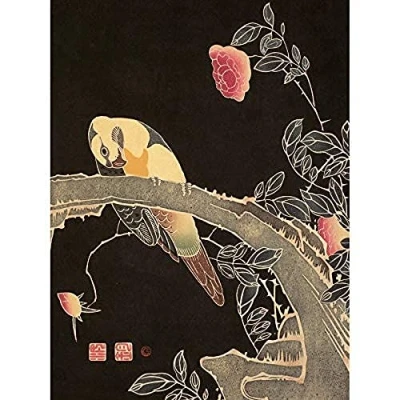 Wee Blue Coo Jakuchu Parrot And Flowering Rose Bush Unframed Art Print Poster Wall Decor 12X16 Inch