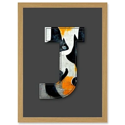 Wee Blue Coo Letter J Abstract Cat Decorative Graffiti Mural Alphabet Initial Stencil Artwork Framed Wall Art Print A4