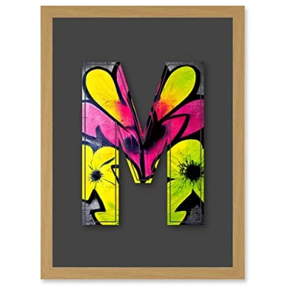 Wee Blue Coo Letter M Neon Yellow Flower Decorative Graffiti Mural Alphabet Initial Stencil Artwork Framed Wall Art Print A4