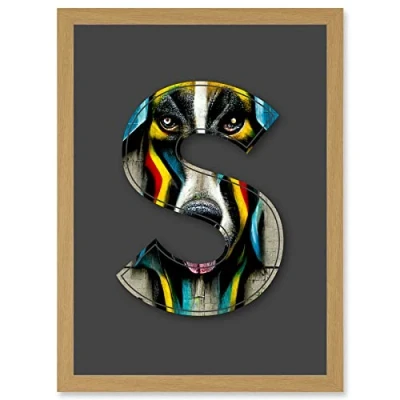 Wee Blue Coo Letter S Stripe Dog Face Multicoloured Decorative Graffiti Mural Alphabet Initial Stencil Artwork Framed Wall Art Print A4