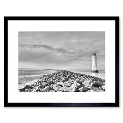 Wee Blue Coo LIGHTHOUSE BLACK AND WHITE JETTTY WHARF SEASCAPE FRAMED ART PRINT MOUNT B12X8762