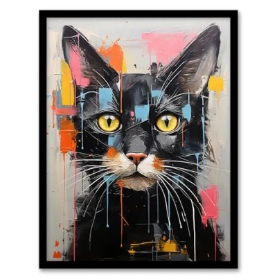 Wee Blue Coo Messy Black Cat Fun Bright Pet Portrait Artwork Framed Wall Art Print A4