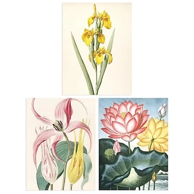 Wee Blue Coo Pack of 3 Audubon Style Vintage Floral Yellow and Pink Flower Blooms Botanical Unframed Wall Art Living Room Prints Set