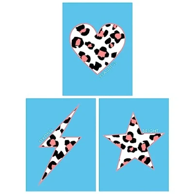 Wee Blue Coo Pack of 3 Pink Leopard Pattern Heart Lightning Star on Beautiful Strong Bright Unframed Wall Art Living Room Prints Set