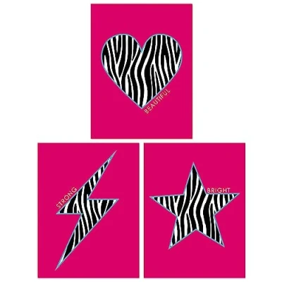 Wee Blue Coo Pack of 3 Zebra Pattern Heart Lightning Star Shape On Block Hot Pink Motivational Unframed Wall Art Living Room Prints Set