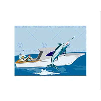 Wee BLUE Coo PAINTING DEEP SEA FISHING MARLIN BOAT JUMP ART PRINT MOUNT B12X8459