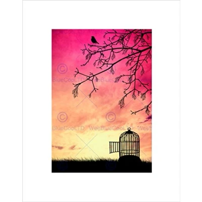 Wee Blue Coo PAINTING DRAWING BIRD CAGE FREE TREE BRANCH SUNSET FRAMED ART PRINT B12X13193