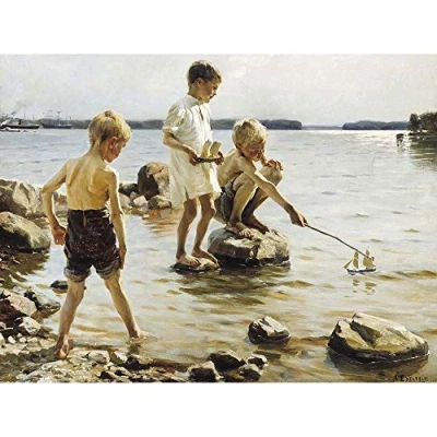 Wee Blue Coo Painting Edelfelt Boys Playing On The Shore Art Print Poster Wall Decor 12X16 Inch