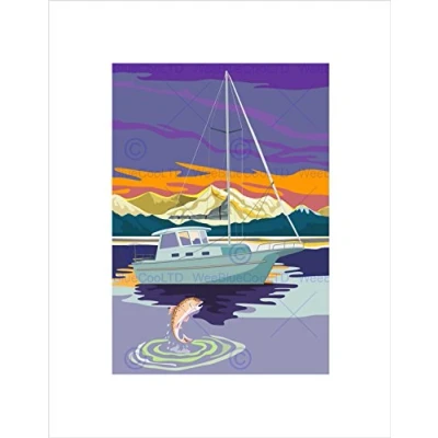 Wee Blue Coo PAINTING FISHING BOAT JUMPING FISH LAKE LANDSCAPE FRAMED ART PRINT B12X8464