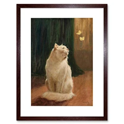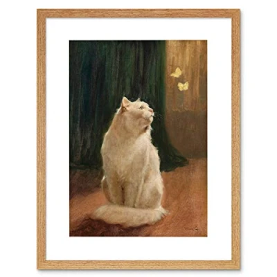 Wee Blue Coo Painting Heyer White Cat And Two Butterflies 12x16 Framed Wall Art Print