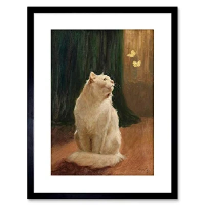 Wee Blue Coo PAINTING HEYER WHITE CAT AND TWO BUTTERFLIES 9x7 FRAMED ART PRINT F97X12726