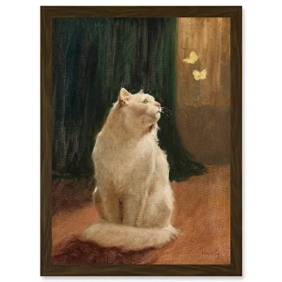 Wee Blue Coo Painting Heyer White Cat And Two Butterflies Artwork Framed Wall Art Print A4