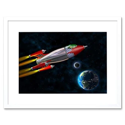 Wee Blue Coo Painting Illustration Cartoon Space Rocket Planet Moon Framed Wall Art Print