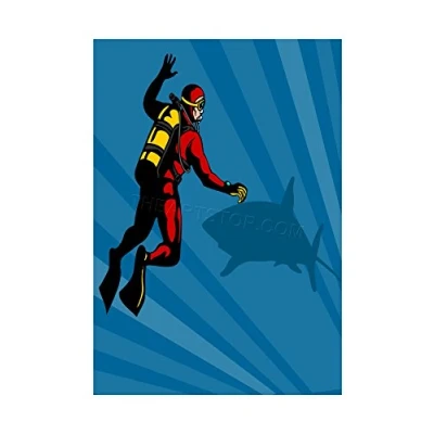 Wee Blue Coo Painting Illustration Underwater Diver Shark Shadow Stalk Wall Art Print