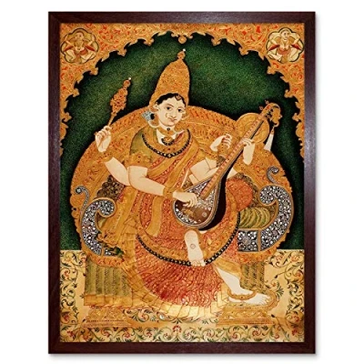Wee Blue Coo Painting Krishnappa Hindu Goddess Saraswati Art Print Framed Poster Wall Decor 12X16 Inch