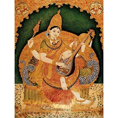 Wee Blue Coo Painting Krishnappa Hindu Goddess Saraswati Art Print Poster Wall Decor 12X16 Inch