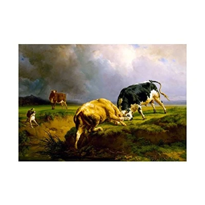 Wee Blue Coo Painting Landscape Rural Brascassat Bulls Fighting Wall Art Print