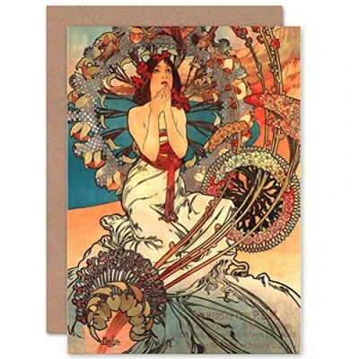 Wee Blue Coo PAINTING MUCHA NOUVEAU WOMAN SPRING FLORAL BLANK GREETINGS CARD