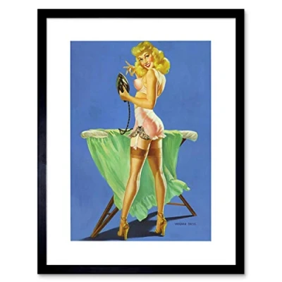 Wee Blue Coo Painting Pin up Girl Lingerie Ironing Board Iron Blonde Framed Wall Art Print