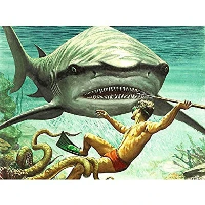 Wee Blue Coo Painting Shark Attack Octopus Diver Spear Adventure Underwater Large Art Print Poster Wall Decor 18x24 inch