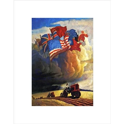 Wee Blue Coo PAINTING WAR WWII ALLIES FLAGS TRACTOR FARMER CLOUDS FRAMED ART PRINT B12X12266