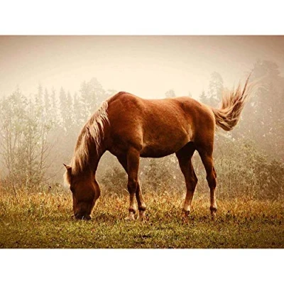 Wee Blue Coo Photography Animal Portrait Grazing Brown Horse Misty Mane Art Print Poster Wall Decor 12X16 Inch