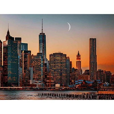Wee Blue Coo Photography Cityscape New York City USA Moon Over Manhattan Art Print Poster Wall Decor 12X16 Inch