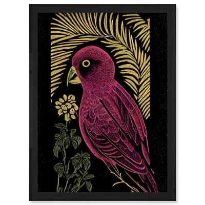 Wee Blue Coo Pink Parrot Bird Black Gold Tropical Plants Modern Vintage Linocut Illustration Artwork Framed Wall Art Print A4