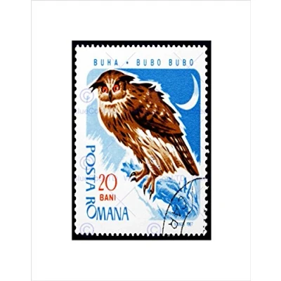 Wee Blue Coo POSTAGE STAMP ROMANIA 20 BANI EAGLE OWL POSTMARKED MOON FRAMED PRINT B12X8279