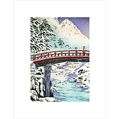Wee Blue Coo POSTCARD JAPAN WINTER SNOW SCENE BRIDGE FOREST MOUTAIN FRAMED PRINT B12X12568