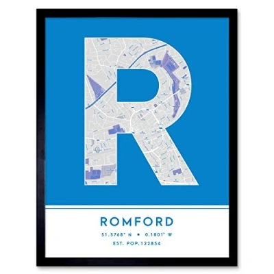 Wee Blue Coo Romford England United Kingdom City Map Colour Block Modern Typography Stylish Letter Framed Word Wall Art Print Poster for Home Décor CITYMAP1